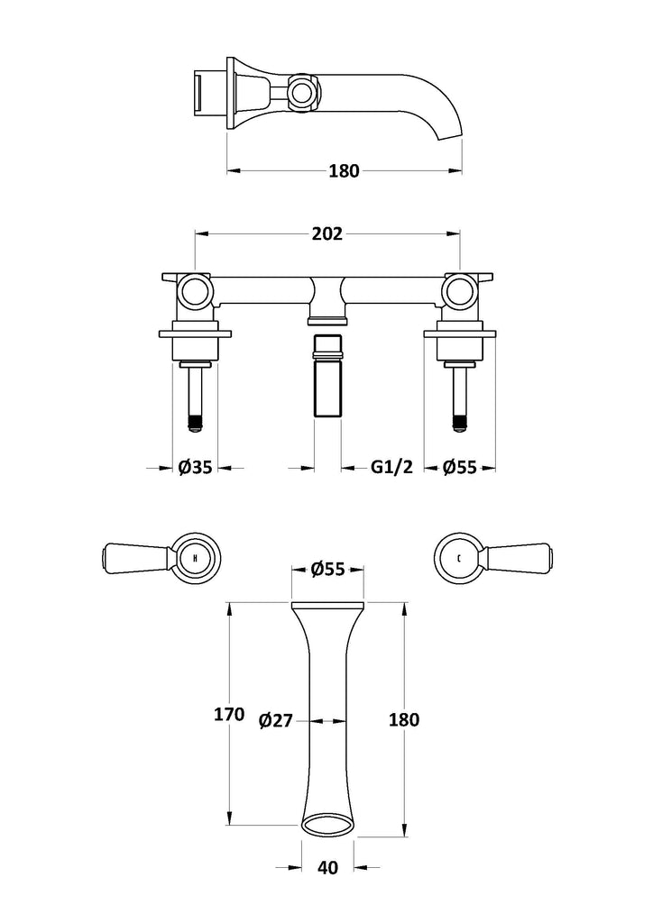 Impressive wall mounted basin mixer incorporating luxury period design with the latest technology. Features ceramic disc technology and High quality brass internals with a luxury chrome finish. Lever taps giving an authentic traditional look whilst being easy to use.
