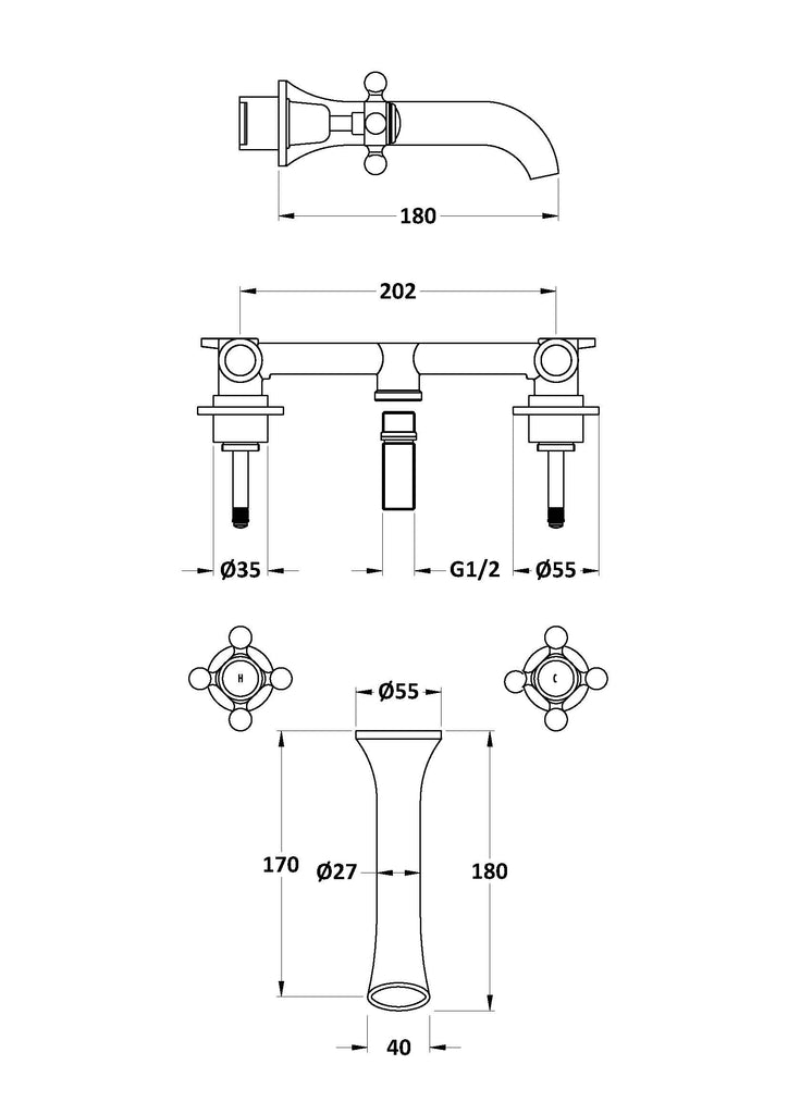 Impressive wall mounted basin mixer incorporating luxury period design with the latest technology. Features ceramic disc technology and High quality brass internals with a luxury chrome finish. Crosshead for authentic traditional look.