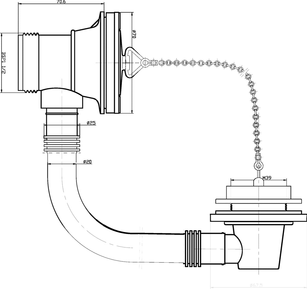 With overflow poly plug & ball chain. Suitable for baths up to 5mm thick.