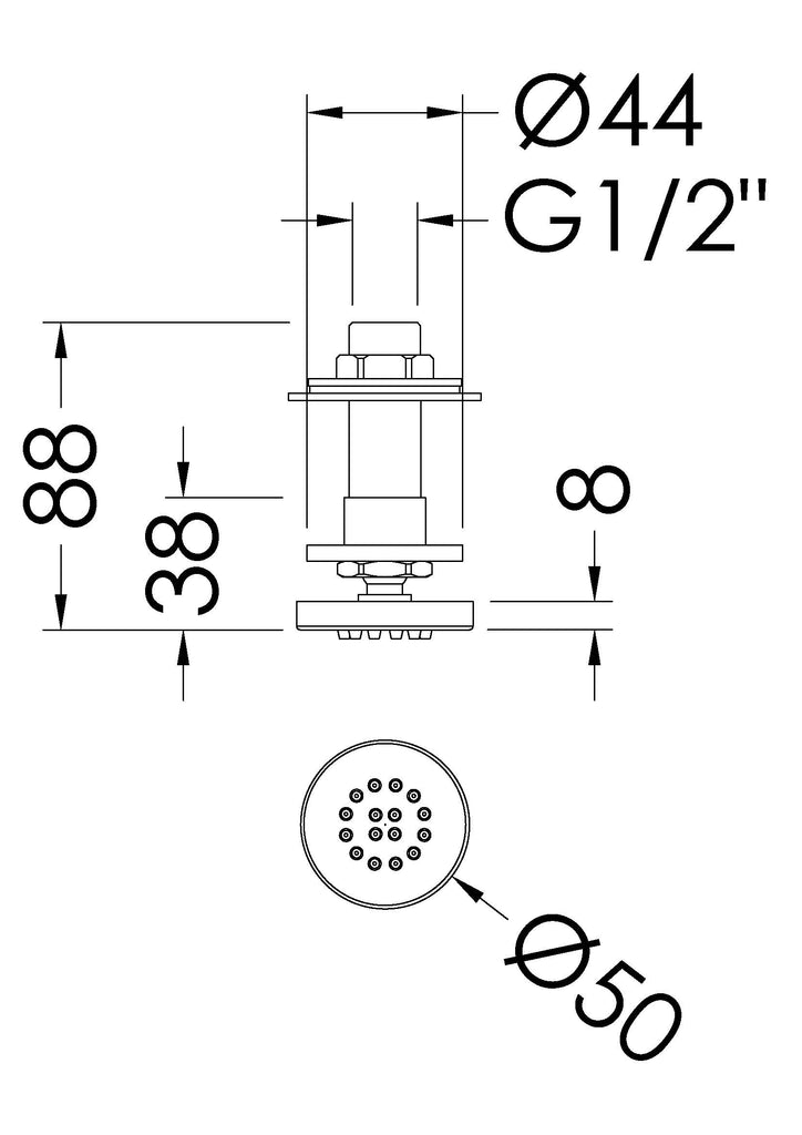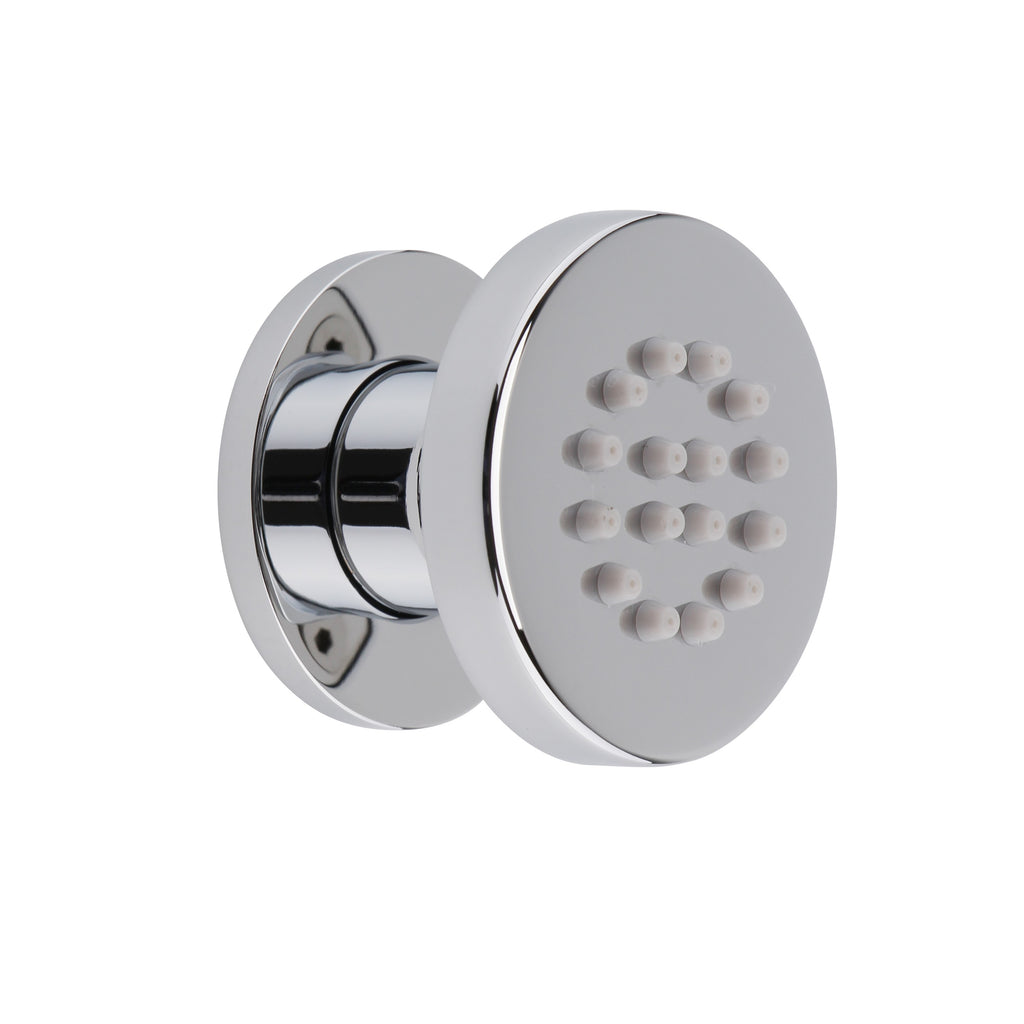 Round contemporary design. Body jet can be adjusted to desired angle. Manufactured from solid brass with a luxury chrome finish.