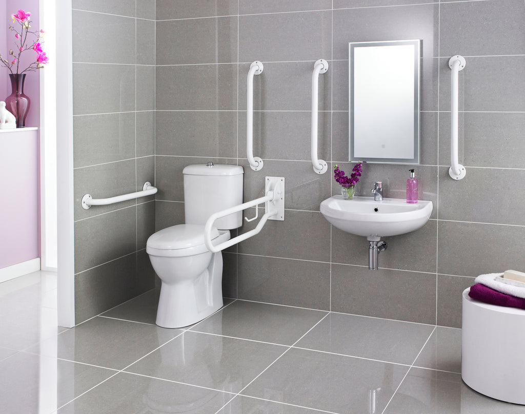 Includes; Comfort Height Doc M Pan, Doc M Cistern, Toilet Seat, Wall Mounted Basin, 5 Grab Rails (5th rail to be fitted to the back of the door), 1 Drop-down Rail & Spray Mixer Tap. Mirror & bottle trap not included.