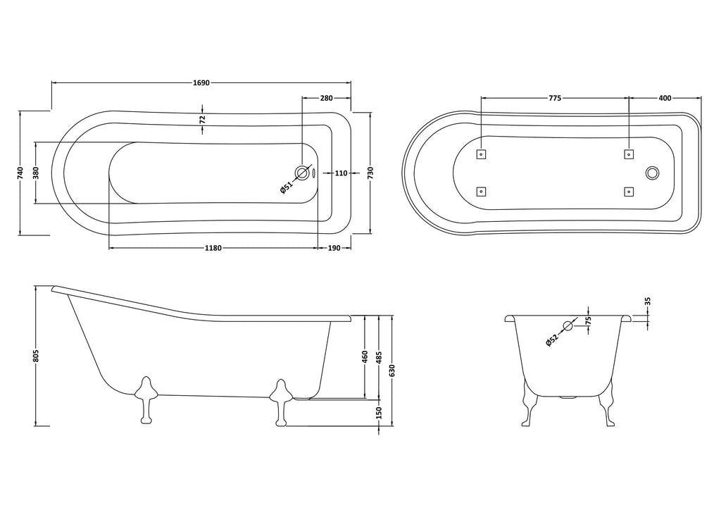 This freestanding bath adds a timeless focal point to any traditional bathroom. Designed and built to the highest quality. Acrylic. All baths come supplied with leg sets as standard. Choice of ornate chrome legs available. Un-drilled. Tap and standpipes not included.