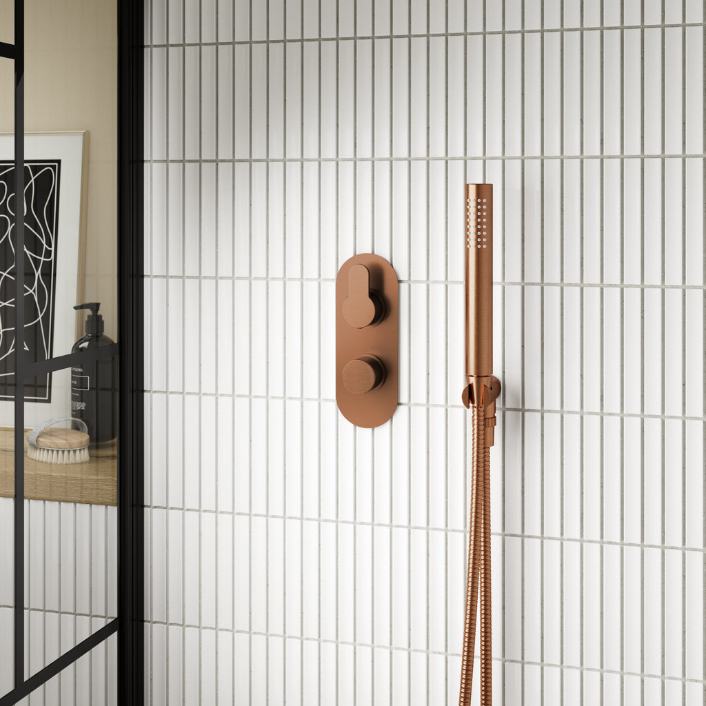 Round minimalist handset design with brushed brass finish. Rub-clean nozzles. 1/2" BSP connections. Brass parking bracket.