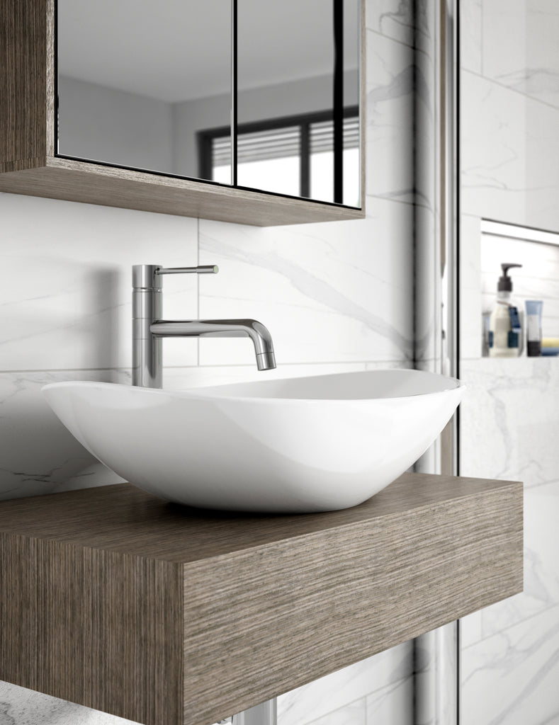 Modern curves creating a clean neat design. Perfect for countertops. Suitable for high rise mixers. Manufactured from high quality vitreous china.