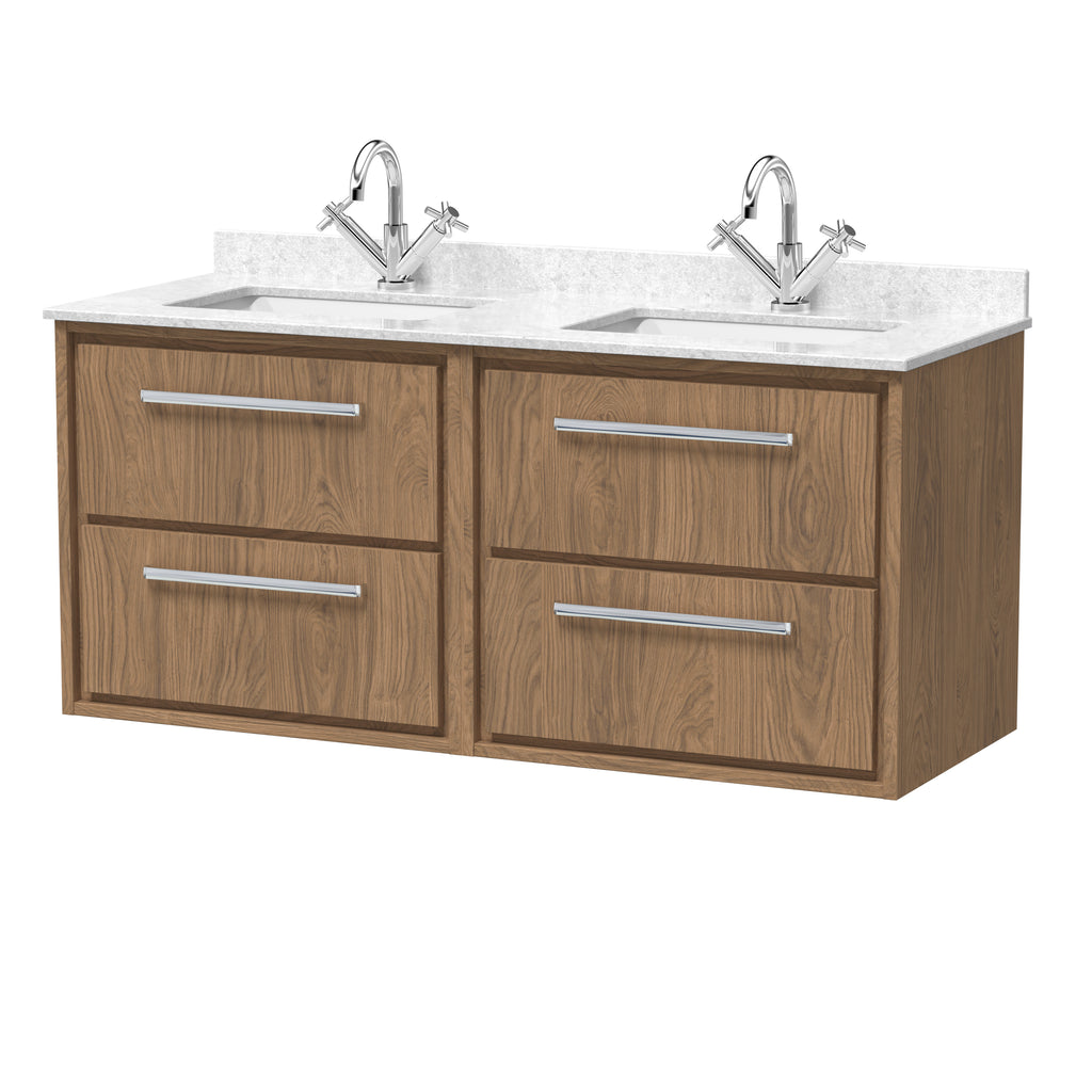 Elevate your bathroom with our contemporary Lille furniture collection. This range features a subtle in-frame design, that creates a unique look and understated design statement. Choose from a selection of woodgrain finishes, and complement your vanity units by choosing from a wide variety of basin and worktop options. This unit is supplied with double marble top underslung basins, pre-drilled with 1 tap hole. All units are supplied with soft close drawers as standard and are fully assembled for easy installation.