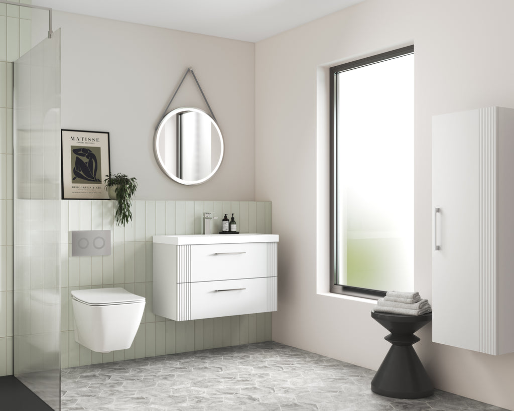 Part fluted design ideal for a striking art deco styled bathroom. Stunning satin finish. Soft close doors and drawers ensures peace ensues throughout your home. Supplied rigid for easy installation. Ceramic basin pre-drilled with 1 tap hole.