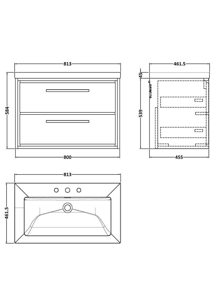 Hudson Reed 800mm Wall Hung 2-Drawer Vanity with Basin - 3 Tap Hole