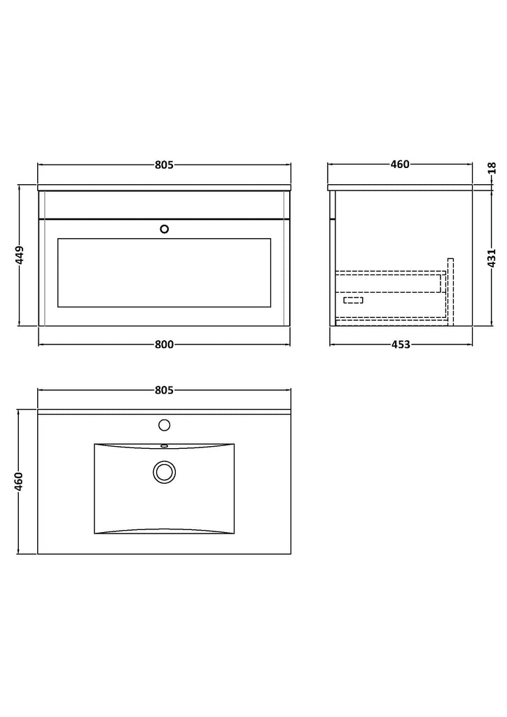 NUIE 800mm Wall Hung Single Drawer Vanity with Basin - 1 Tap Hole