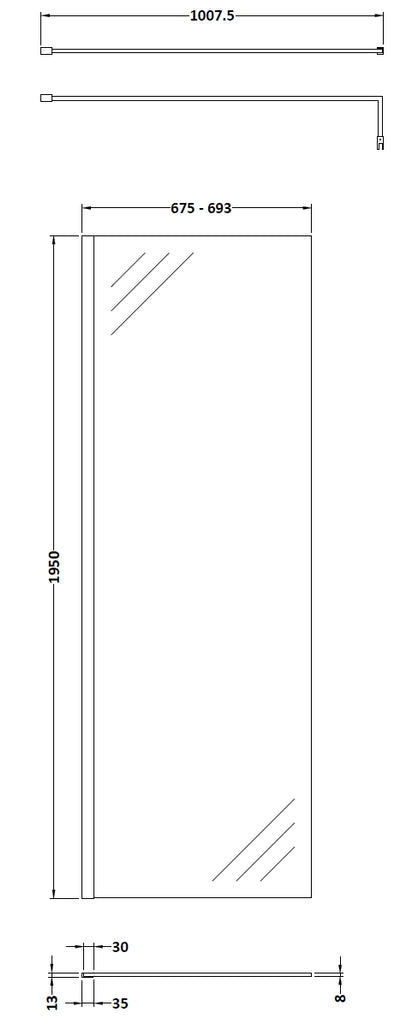 8mm toughened safety glass. Single-sided 'Shower Shield' coated glass. Shower tray sold separately. Includes matt black support bar and profile kit.