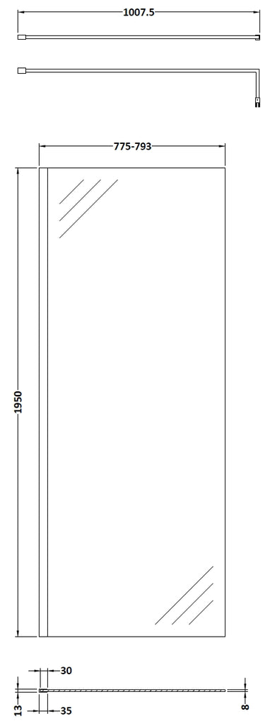 8mm toughened safety glass. Single-sided 'Shower Shield' coated glass. Shower tray sold separately. Includes polished chrome support bar. All wetroom screens are backed by a lifetime guarantee.