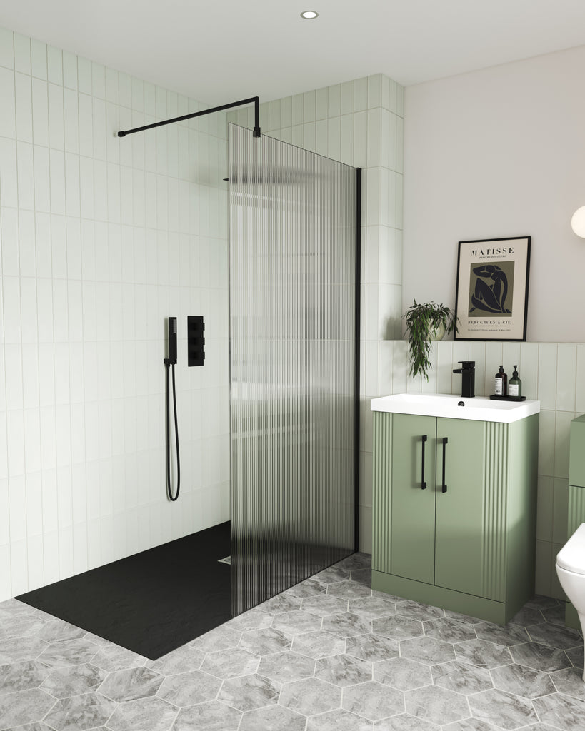 Fluted design ideal for infusing Art Deco elegance into your bathroom. Creates additional privacy. Height 1850mm. Features 8mm toughened safety glass.
