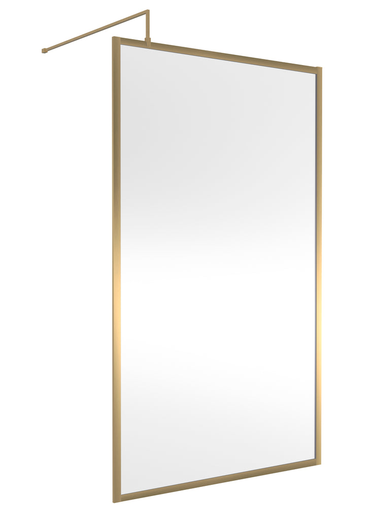 On trend brushed brass full outer frame design. 8mm toughened safety glass. Single-sided 'Shower Shield' coated glass. Shower tray sold separately. Includes support bar and profile kit.