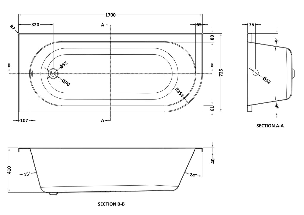Luxury back to wall corner bath. Designed and built to the highest quality. Supplied with leg set.